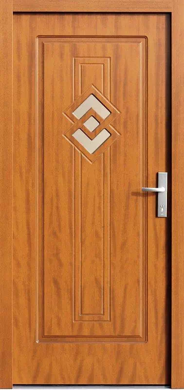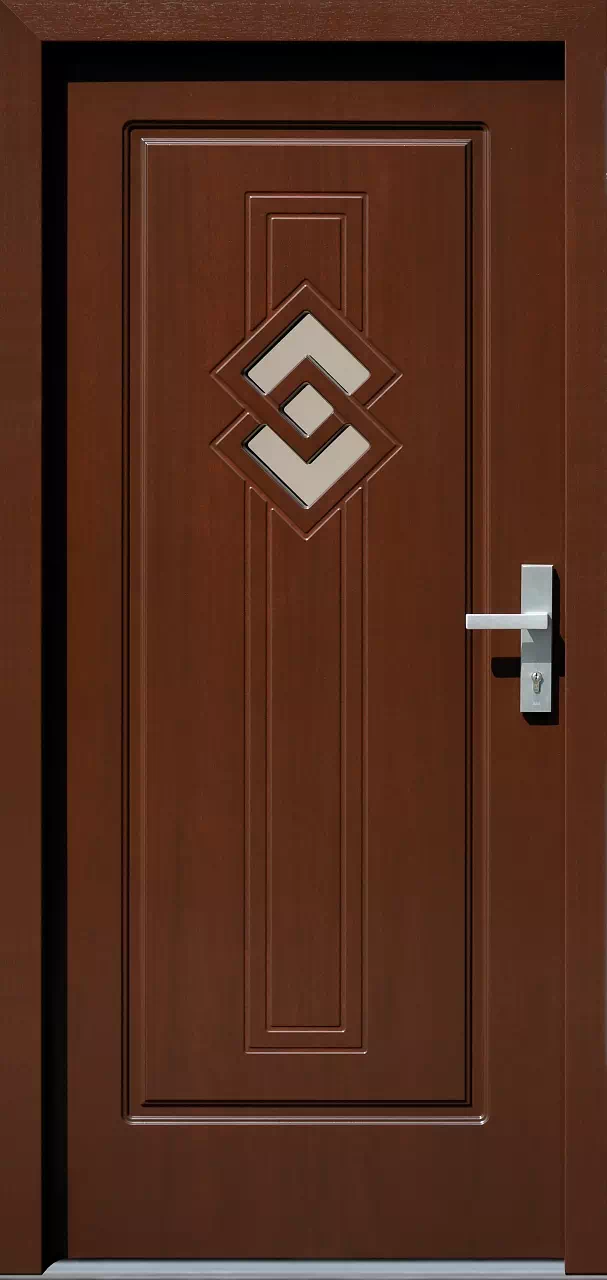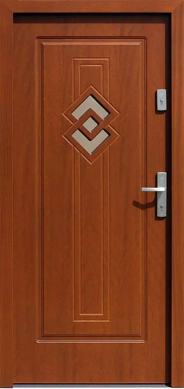 Małe przeszklenia pełnią jedynie funkcję dyskretnego wizjera. Powyższy, przykładowy egzemplarz drzwi zewnętrznych został wymalowany na kolor: orzech.