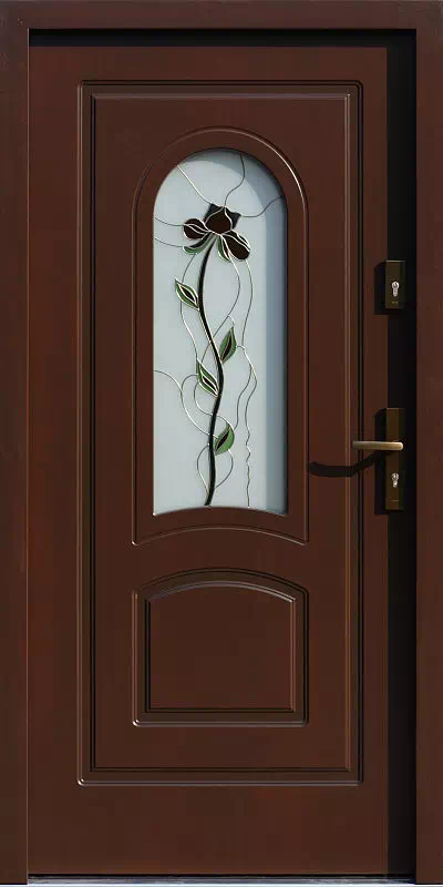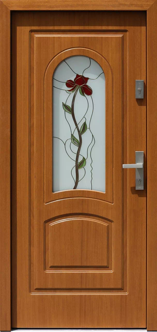 Wzór samego witrażu i dobór jego kolorów może być indywidualnie uzgodniony pomiędzy pracownią wykonującą witraż a klientem. Powyższy, przykładowy egzemplarz drzwi zewnętrznych został wymalowany na kolor: złoty dąb.