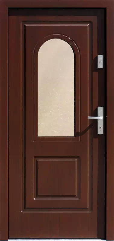 Duże przeszklenie w tym wzorze drzwiach pełni funkcję efektywnego doświetlenia domu w którym zostały zamontowane. Powyższy, przykładowy egzemplarz drzwi zewnętrznych został wymalowany na kolor: orzech ciemny.