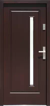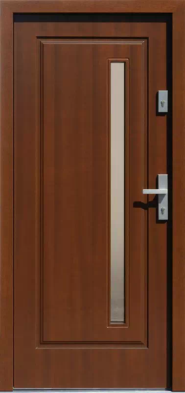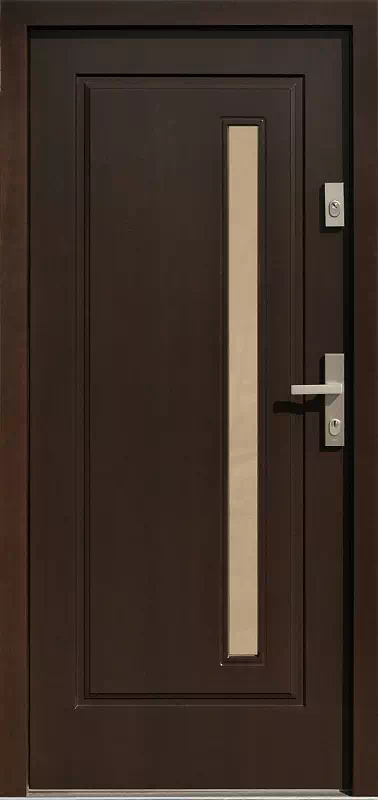 W tym modelu drewnianych drzwi zewnętrznych z szybą zastosowaliśmy płytkie przefrezowanie dookoła szyby, które imituje tradycyjnie wykonywaną listwę przyszybową. Dodatkowo w tym modelu zastosowaliśmy „modne w ostatnim czasie - kanciaste narożniki kasetonów”. Powyższy, przykładowy egzemplarz drzwi zewnętrznych został wymalowany na kolor: orzech.