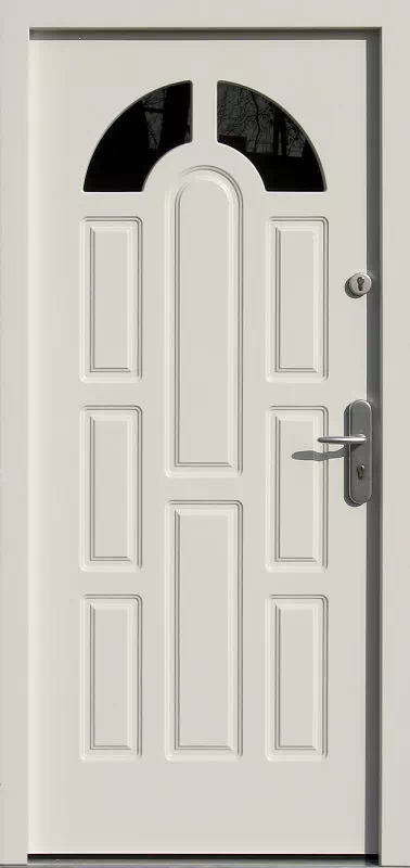 Kolejny starodawny model drzwi wejściowych, który aktualnie jest bardzo rzadko zamawiany. Powyższy, przykładowy egzemplarz drzwi zewnętrznych został wymalowany na kolor: białe.