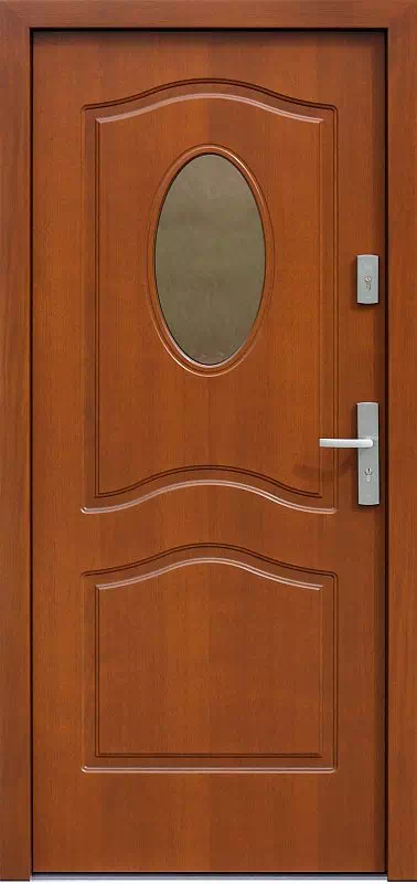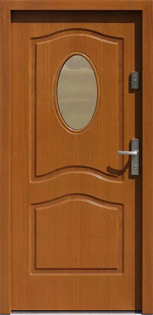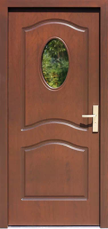 Płytka obwódka dookoła szyby wykonana w tych drzwiach wyprodukowanych w technologii płytowej, imituje tradycyjną listwę przyszybową stosowaną w tradycyjnej ramowej technologii wykonywania drzwi zewnętrznych. Powyższy, przykładowy egzemplarz drzwi zewnętrznych został wymalowany na kolor: teak.