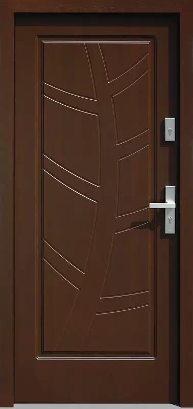 Model ten także często montujemy jako drzwi wejściowe do mieszkań. Powyższy, przykładowy egzemplarz drzwi zewnętrznych został wymalowany na kolor: ciemny dąb.
