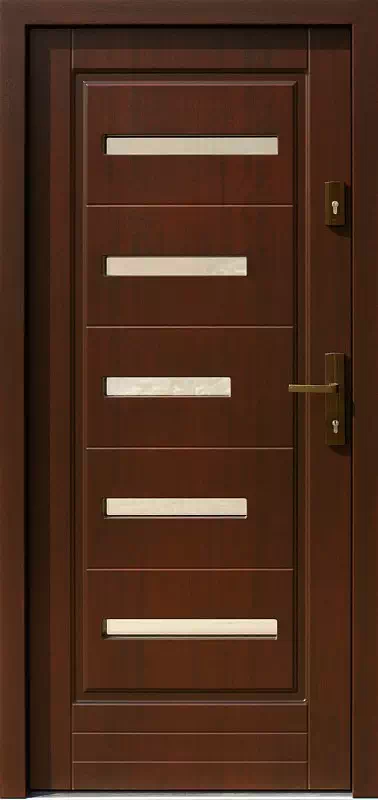 Niezbyt duża powierzchnia szyb nie gwarantuje dobrego doświetlenia wnętrza domu a stanowi raczej formę ozdobną i robi za szczelinowe wizjery. Powyższy, przykładowy egzemplarz drzwi zewnętrznych został wymalowany na kolor: orzech ciemny.