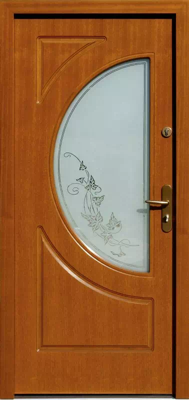 Piaskowany motyw roślinny wypiaskowany na szybie tego modelu drewniach drzwi zewnętrznych w tym modelu jest przykładowym, ale jednocześnie też najczęściej zamawianym przez klientów. Powyższy, przykładowy egzemplarz drzwi zewnętrznych został wymalowany na kolor: złoty dąb.