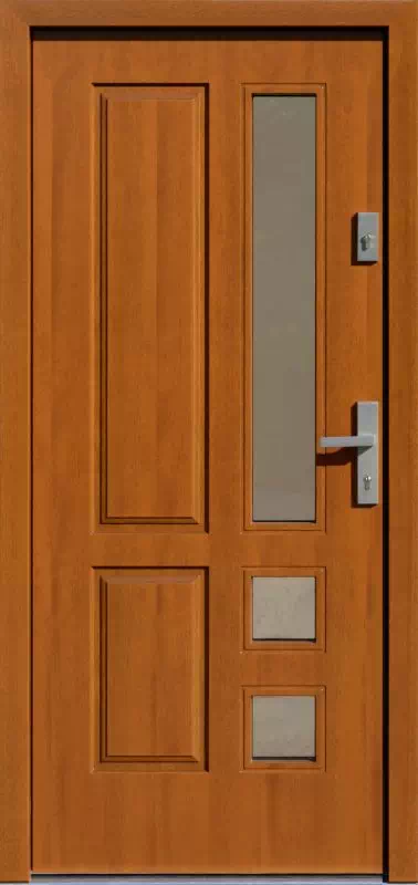 Jest to jeden z ponadczasowych modeli które dobrze wyglądają i są przy tym bardzo funkcjonalne. Powyższy, przykładowy egzemplarz drzwi zewnętrznych został wymalowany na kolor: złoty dąb.
