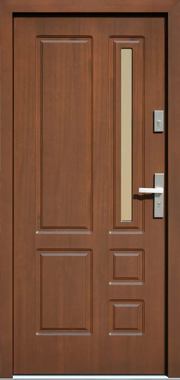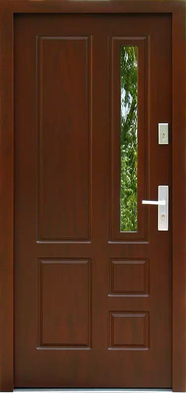 Jest najczęściej zamawiany przez osoby starsze które szukają klasyki i poczucia bezpieczeństwa które daje wyjątkowa wąska szyba. Powyższy, przykładowy egzemplarz drzwi zewnętrznych został wymalowany na kolor: orzech.