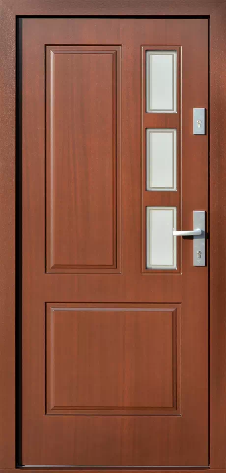 Bezbarwne ramki dookoła wypiaskowanych prostokątów, w centralnych polach przeszkleń, umożliwiają dobrą obserwację otoczenia przed z domem z jego wnętrza. Powyższy, przykładowy egzemplarz drzwi zewnętrznych został wymalowany na kolor: orzech.