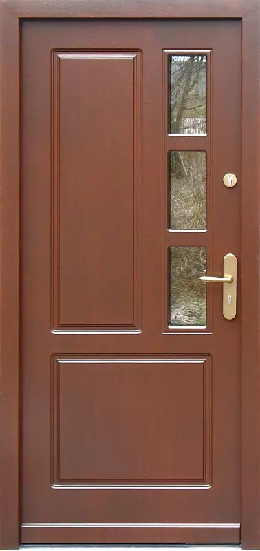 Model drzwi wejściowych zamawiany zwykle przez starsze pokolenie do starszych, remontowanych domów. Powyższy, przykładowy egzemplarz drzwi zewnętrznych został wymalowany na kolor: orzech ciemny.