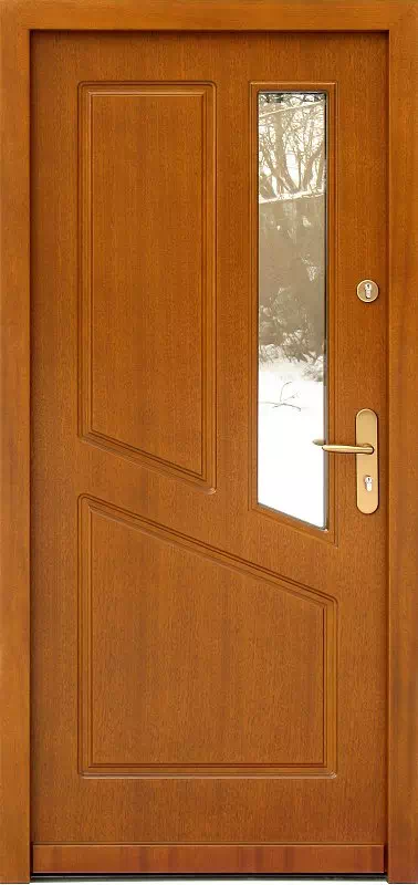 Wzór drzwi przeznaczony do klasycznych domów zaprojektowanych z odważnymi elementami stylistycznymi. Powyższy, przykładowy egzemplarz drzwi zewnętrznych został wymalowany na kolor: złoty dąb.