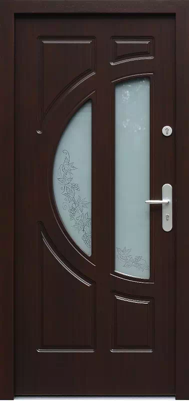 Wzór ornamentu piaskowanego na szybie jest indywidualnie uzgadniany z nasza pracownią, które je wykonuje. Powyższy, przykładowy egzemplarz drzwi zewnętrznych został wymalowany na kolor: palisander.