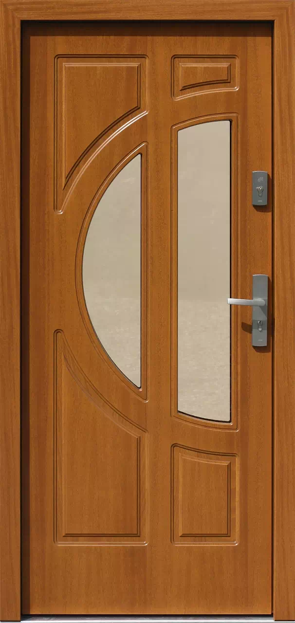 Duża powierzchnia przeszkleń i zrównoważona, dopracowana forma geometryczna tego wzoru drewnianych drzwi zewnętrznych od 3 dekad cieszy się zainteresowaniem wśród klientów naszego zakładu produkcyjnego. Powyższy, przykładowy egzemplarz drzwi zewnętrznych został wymalowany na kolor: złoty dąb.
