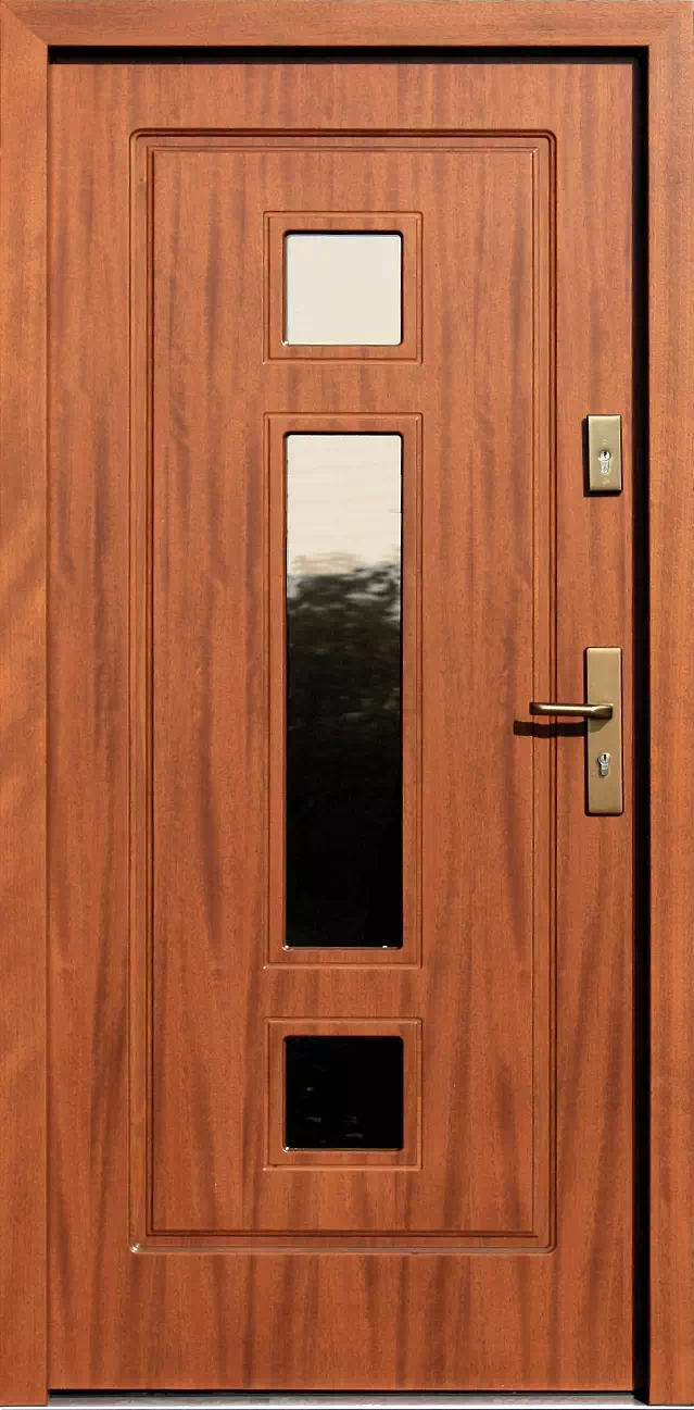 Ta modyfikacja sprawiła że drzwi są bardziej przeszklone i lepiej oświetlają wnętrze domu. Powyższy, przykładowy egzemplarz drzwi zewnętrznych został wymalowany na kolor: ciemny dąb.