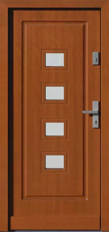 Wymiary szybek, rozmieszczenie i ilość jest do uzgodnienia przed montażem drzwi. Powyższy, przykładowy egzemplarz drzwi zewnętrznych został wymalowany na kolor: ciemny dąb.