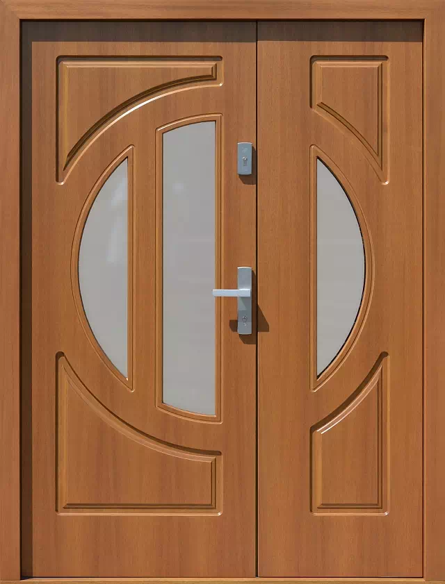 Model ten jest jednym z najbardziej przeszklonych modeli dwuskrzydłowych. Powyższy, przykładowy egzemplarz drzwi zewnętrznych został wymalowany na kolor: złoty dąb.