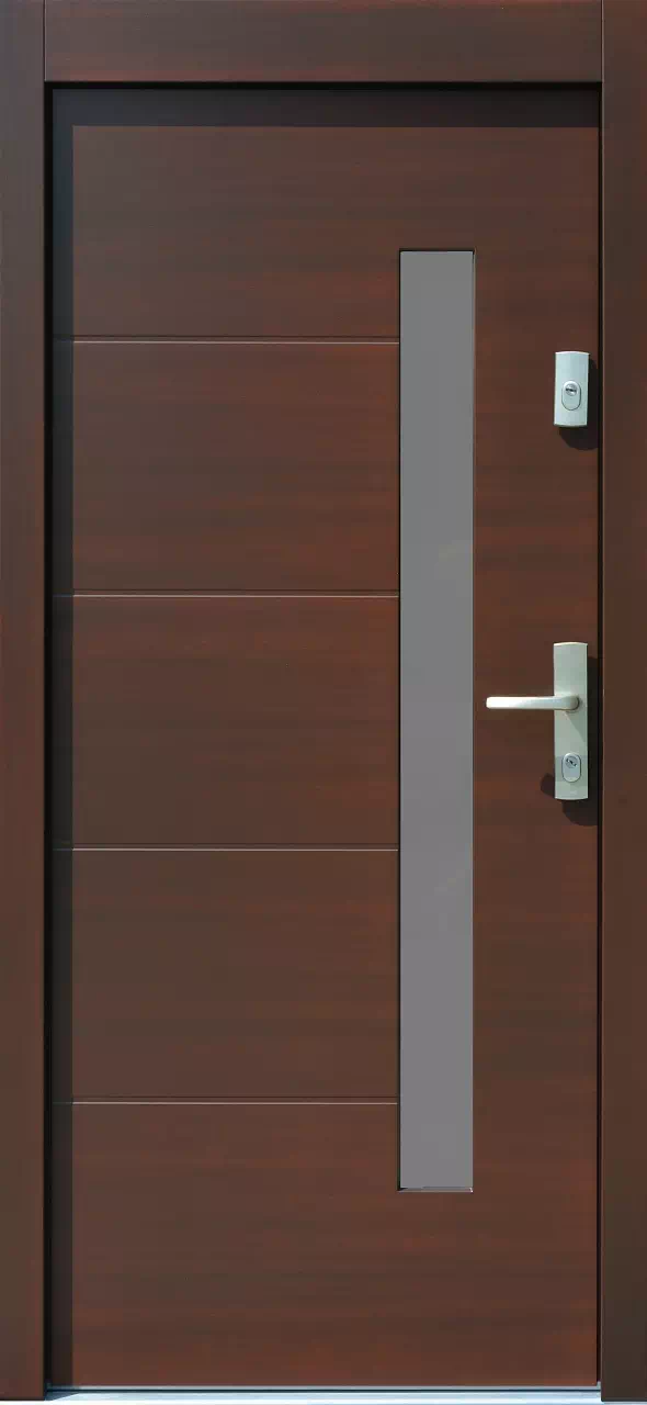 Ten model drzwi ładnie się wpisuje w nowoczesne domy. Powyższy, przykładowy egzemplarz drzwi zewnętrznych został wymalowany na kolor: teak.