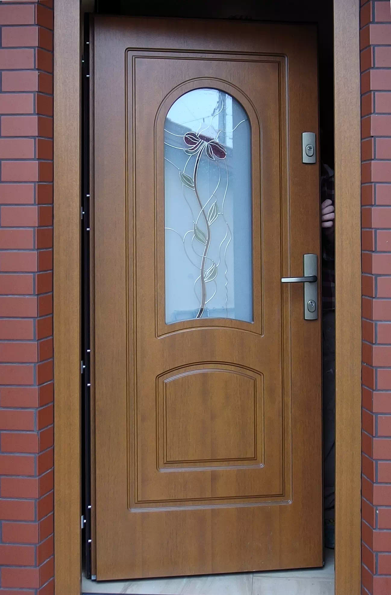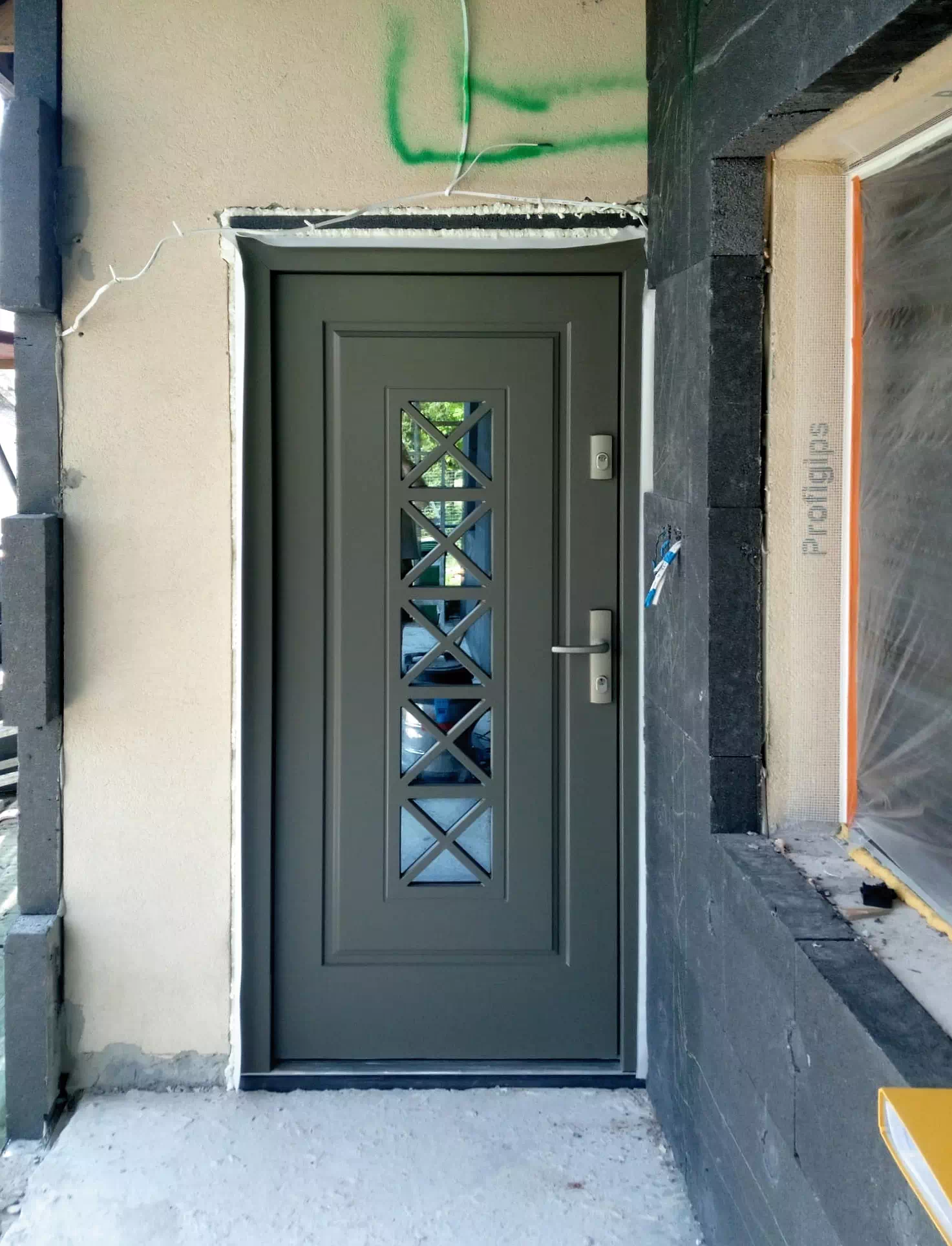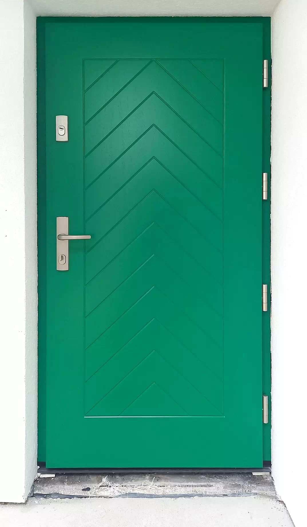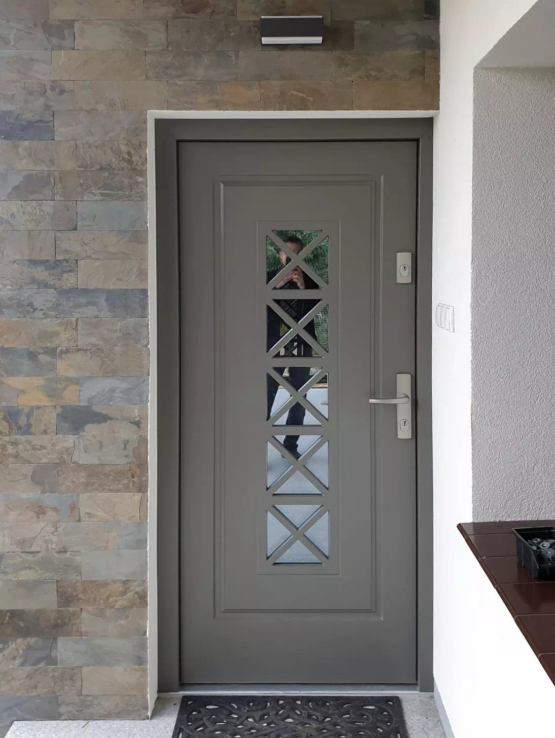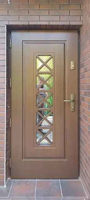 Przykład wymiany drzwi wejściowych na szklony model drzwi zewnętrznych którego wzór oparty na tradycyjnej klepkowej technologii produkcji i wykorzystaniu nowoczesnej technologii produkcji z użyciem obrabiarek CNC. Jest on najczęściej montowany w domach jednorodzinnych o tradycyjnej architekturze.