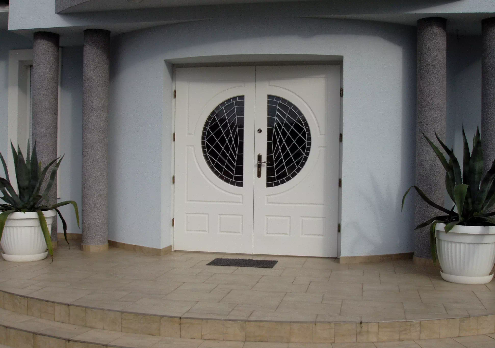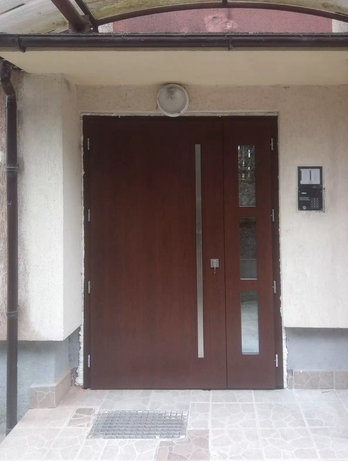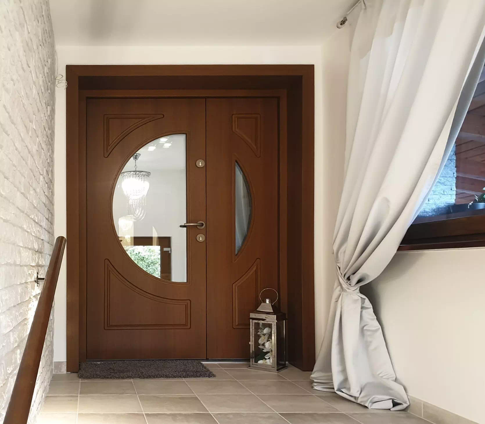 Przykład wymiany dwuskrzydłowych drzwi wejściowych na klasyczny, prawie już kultowy model, z naszej oferty produkcyjnej. Jest on najczęściej montowany i wymieniany w domach jednorodzinnych o dużej powierzchni użytkowej urządzanych w tradycyjnym, klasycznym stylu.