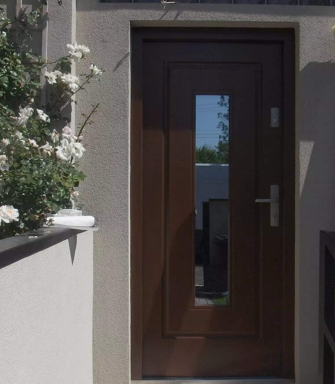 Przykłady wymiany drzwi drewnianych na najprostszy, klasyczny model drzwi zewnętrznych spośród naszej oferty produkcyjnej. Jeden duży kaseton wypełnia skrzydło drzwiowe i nadaj drzwiom, i tym samym domowi w którym są zamontowane, gustownego, eleganckiego stylu.