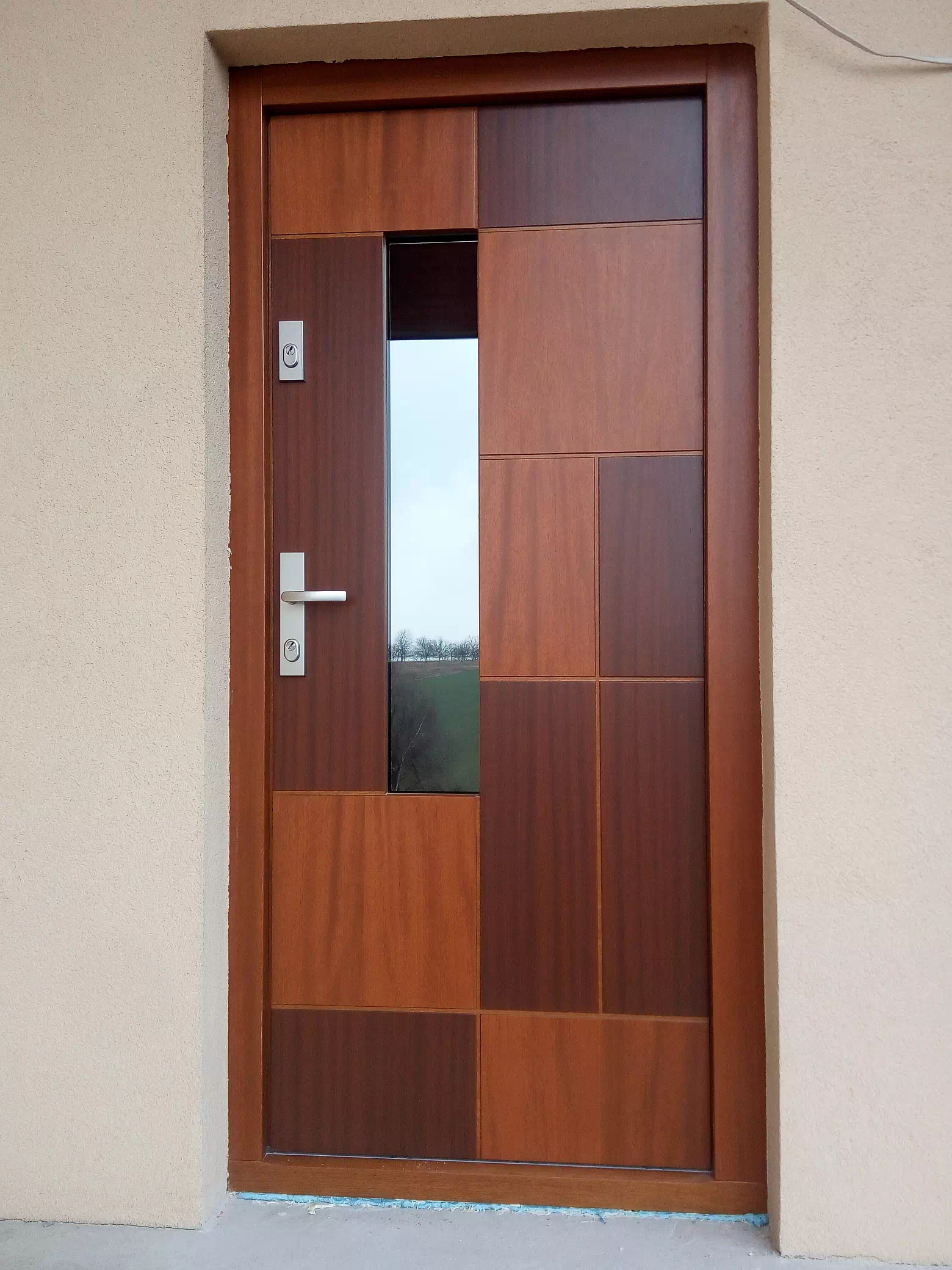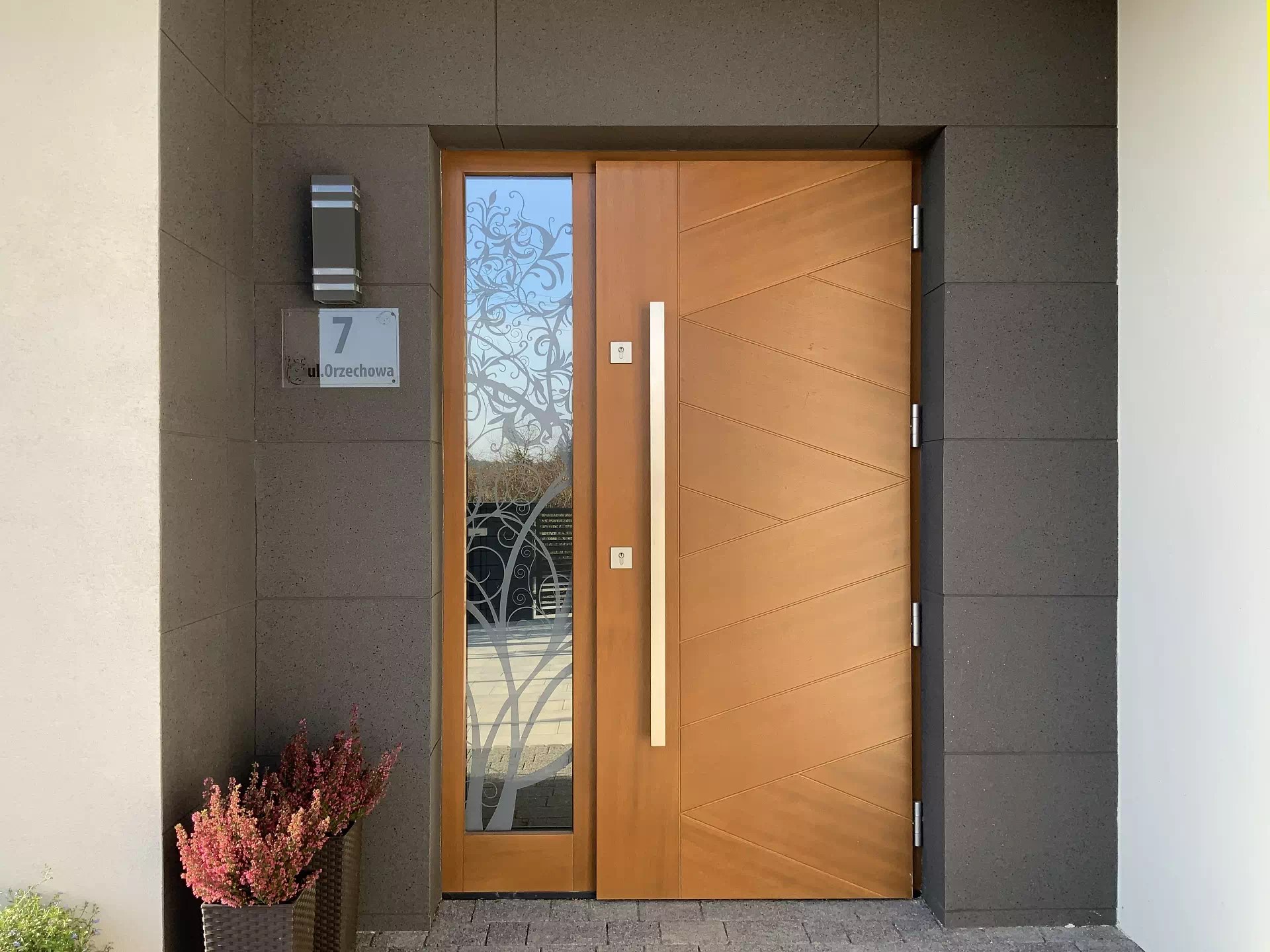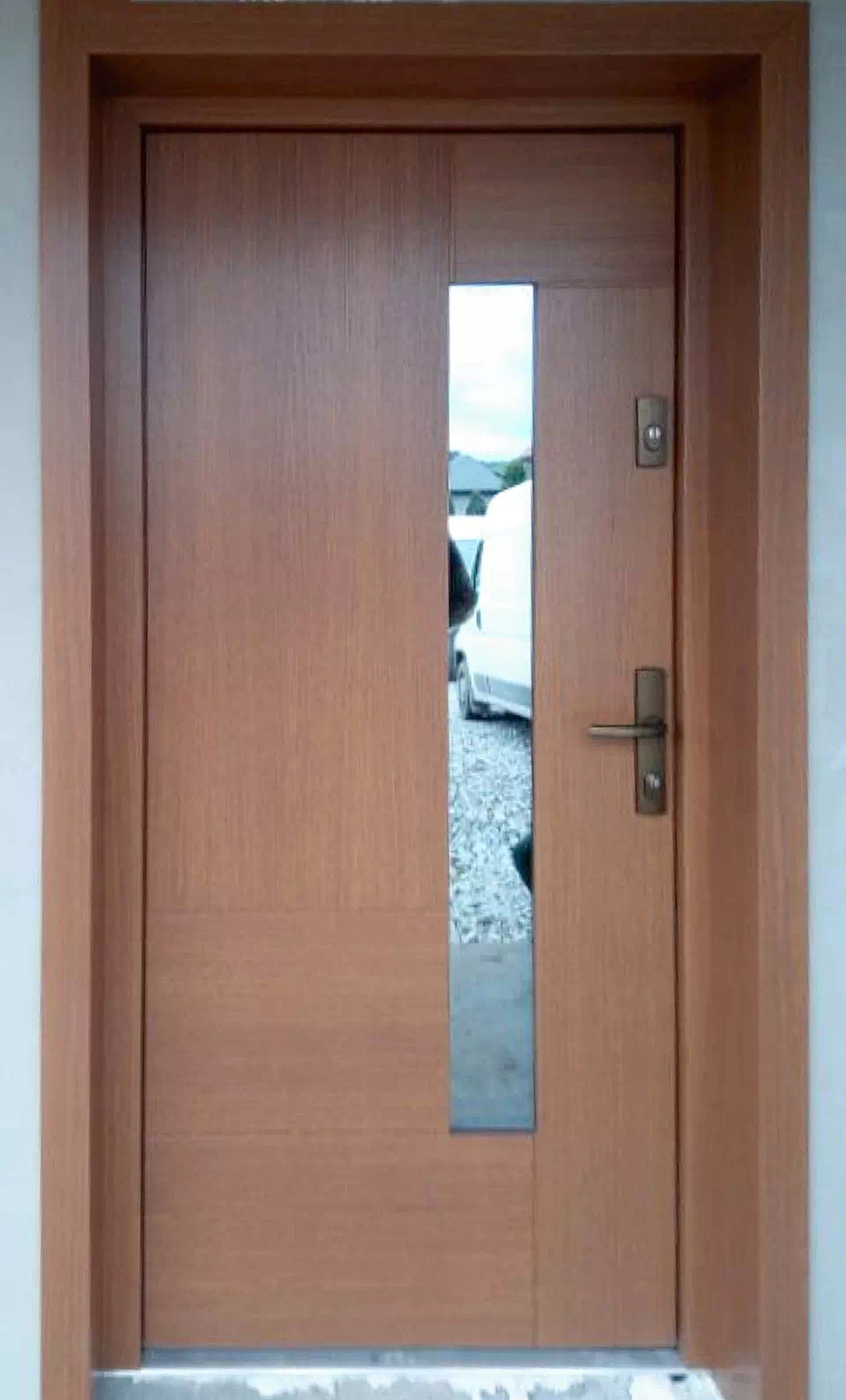 Powyższe przykładowe realizacje przedstawiają najpopularniejszy i najprostszy model drzwi zewnętrznych z naszej oferty produkcyjnej. Charakteryzuje się on brakiem przeszkleń i przefrezowan ozdobnych. Jego cechą charakterystyczną jest pionowe usłojenie drewnianej okleiny skrzydła drzwiowego. Za ozdobę tego wzoru drzwi robi najczęściej wielokolorowa kompozycja ościeżnicy, i skrzydła, a niekiedy pochwyt rurowy (antaba) i odbojnik (kopacz) wykonany z drewna lub blachy inox.