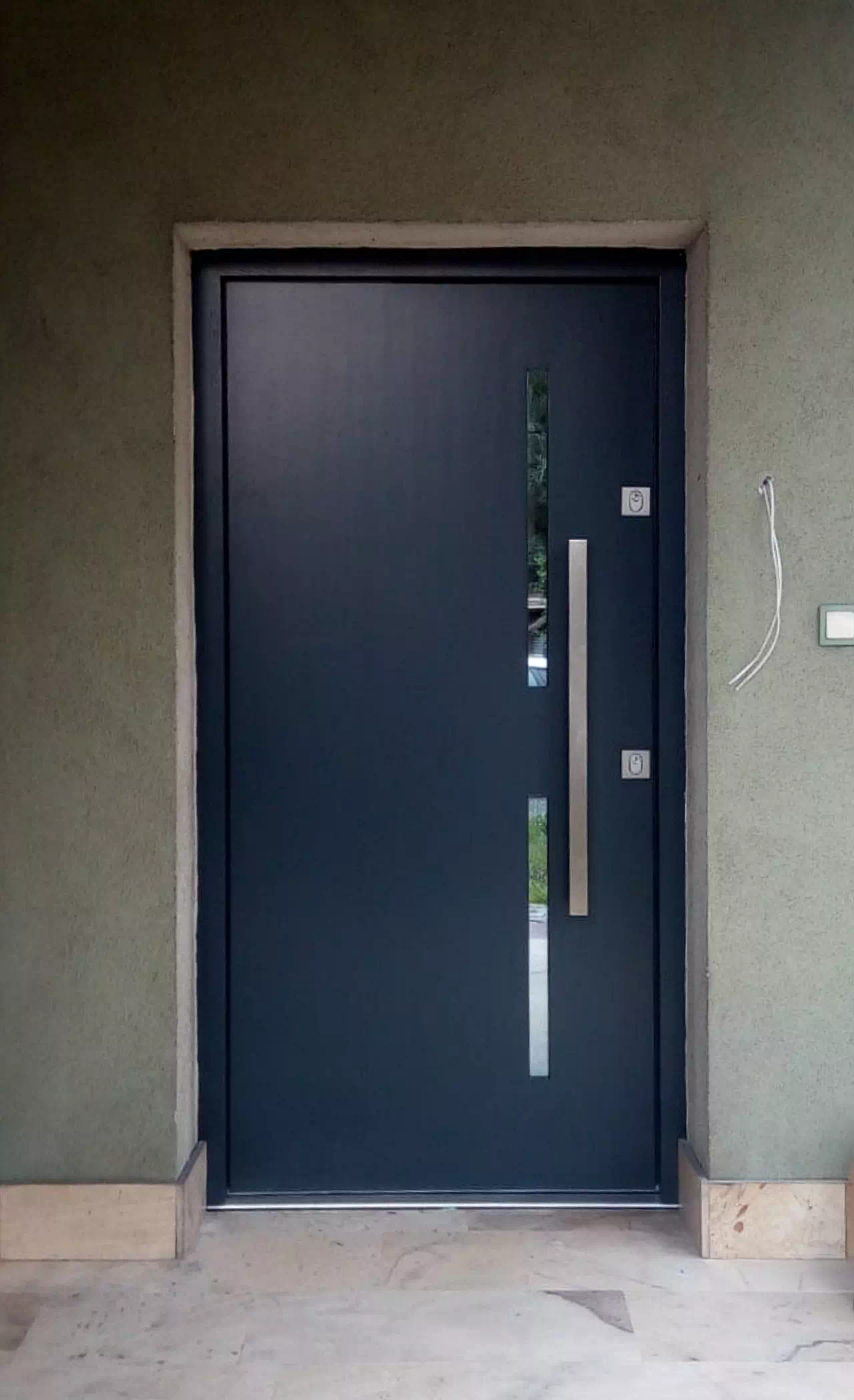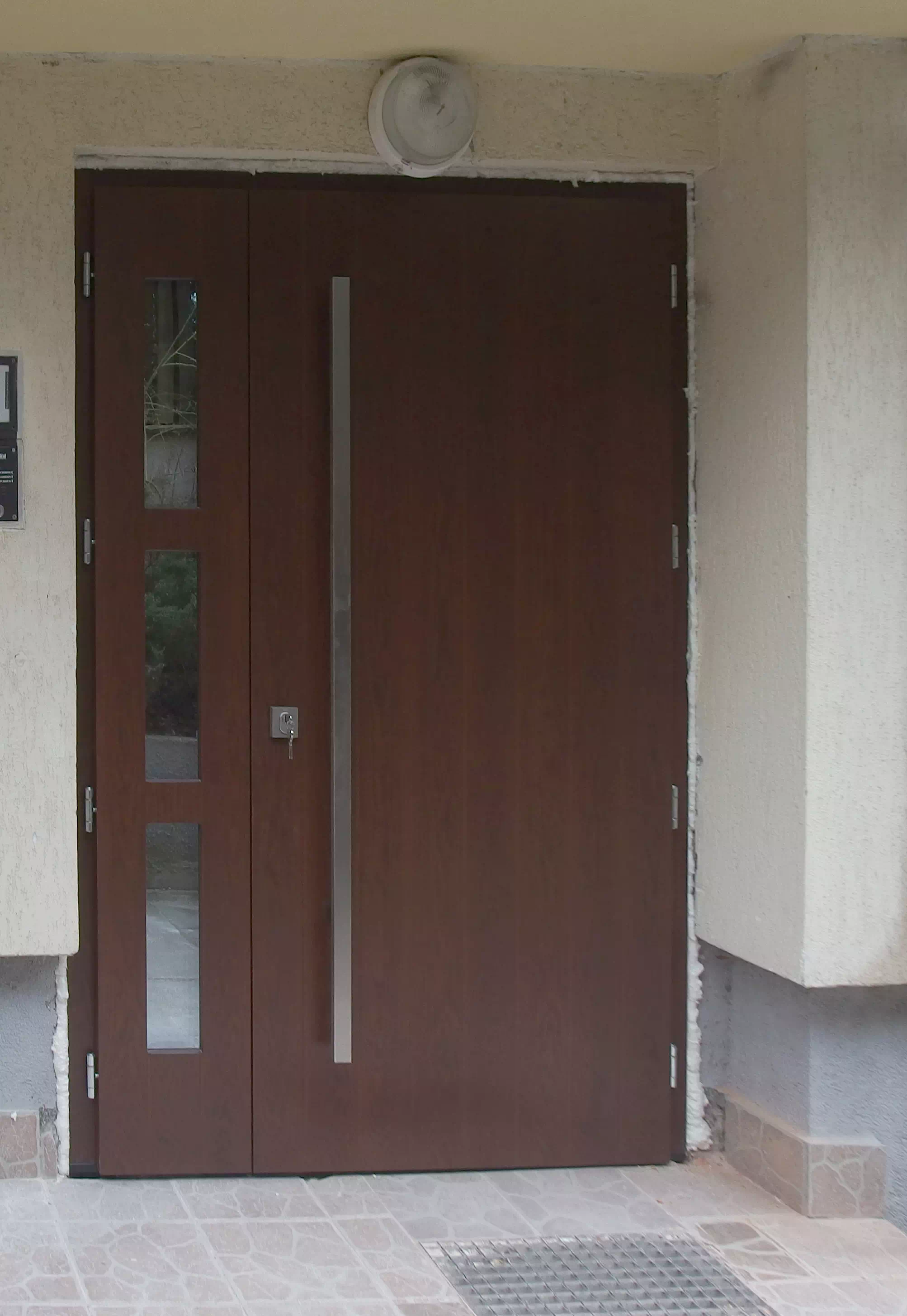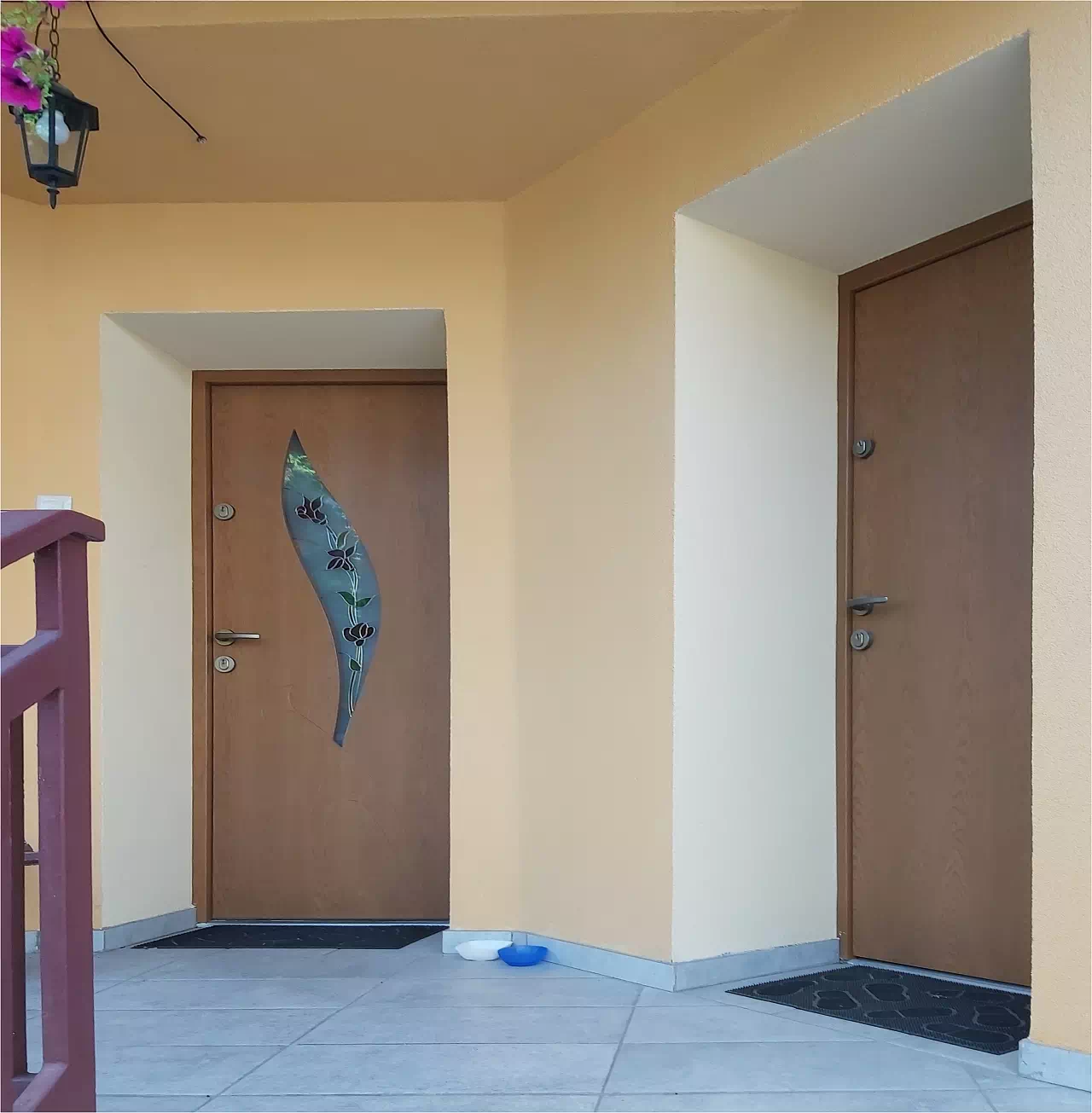 Powyższe przykładowe realizacje przedstawiają najpopularniejszy i najprostszy model drzwi zewnętrznych z naszej oferty produkcyjnej. Charakteryzuje się on brakiem przeszkleń i przefrezowan ozdobnych. Jego cechą charakterystyczną jest pionowe usłojenie drewnianej okleiny skrzydła drzwiowego. Za ozdobę tego wzoru drzwi robi najczęściej wielokolorowa kompozycja ościeżnicy, i skrzydła, a niekiedy pochwyt rurowy (antaba) i odbojnik (kopacz) wykonany z drewna lub blachy inox.
