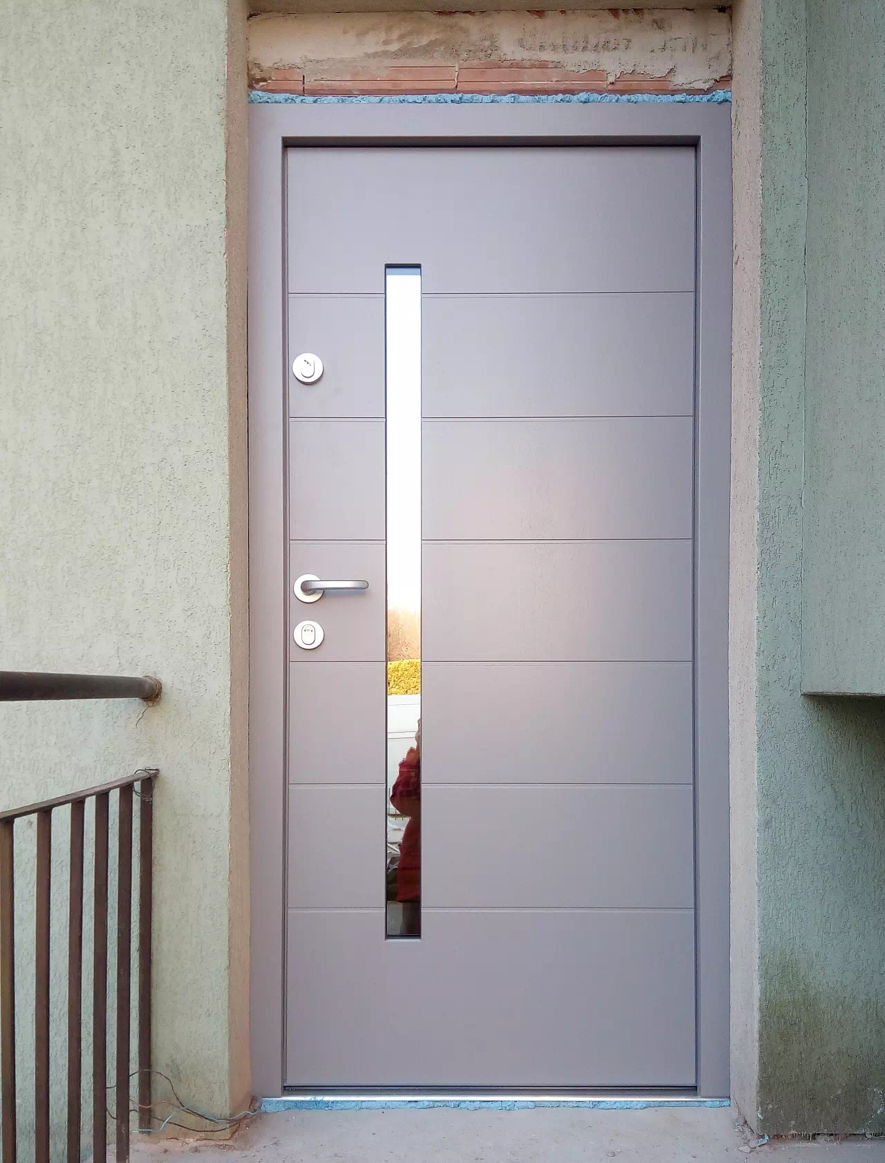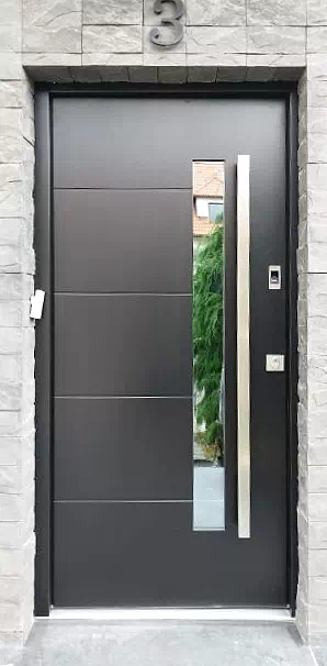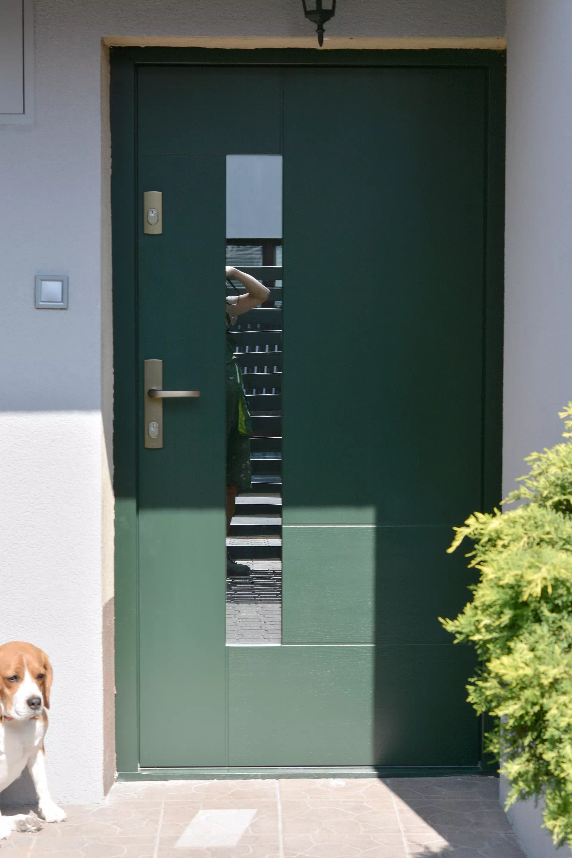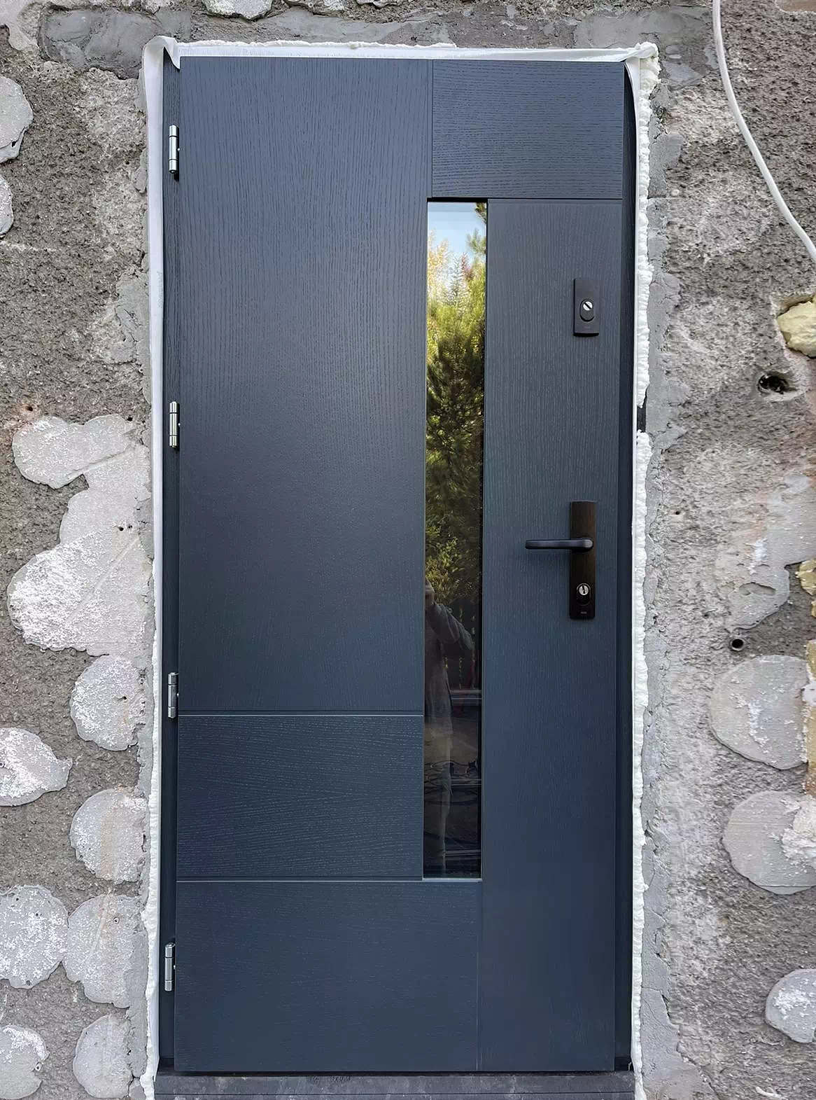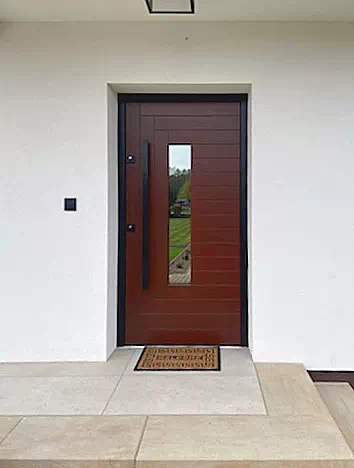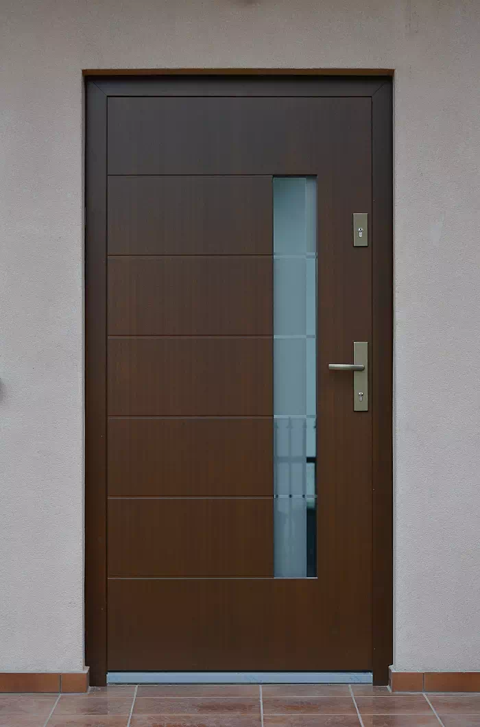 Ten model drzwi wejściowych charakteryzuje wyjątkowo skromnym wzornictwem ograniczającym się do jednego prostokątnego przeszklenia usytuowanego centralnie na skrzydle drzwiowym. Drzwi te są zwykle montowane lub wymieniane w domach jednorodzinnych o ascetycznie skromnej bryle architektonicznej budynku.