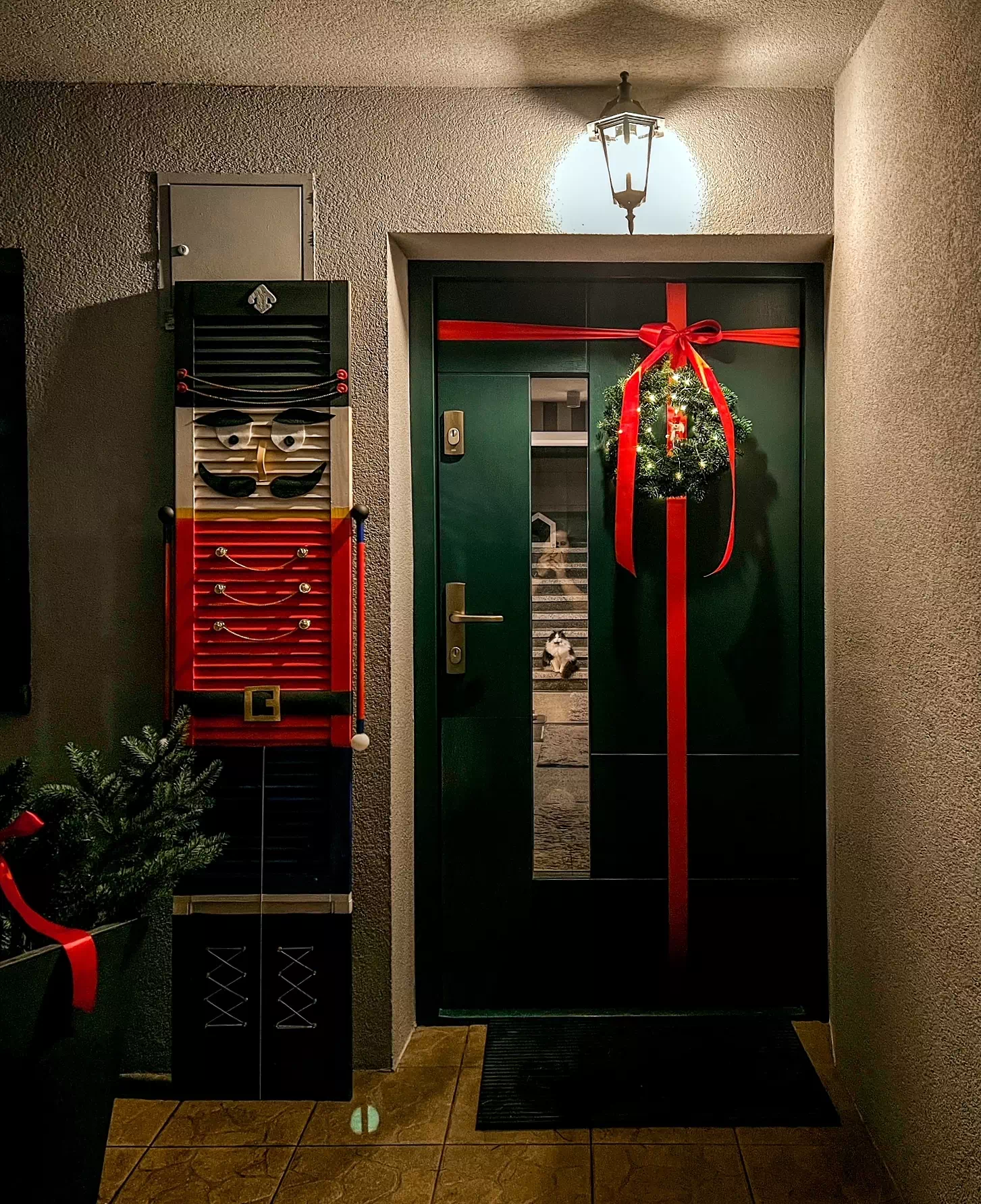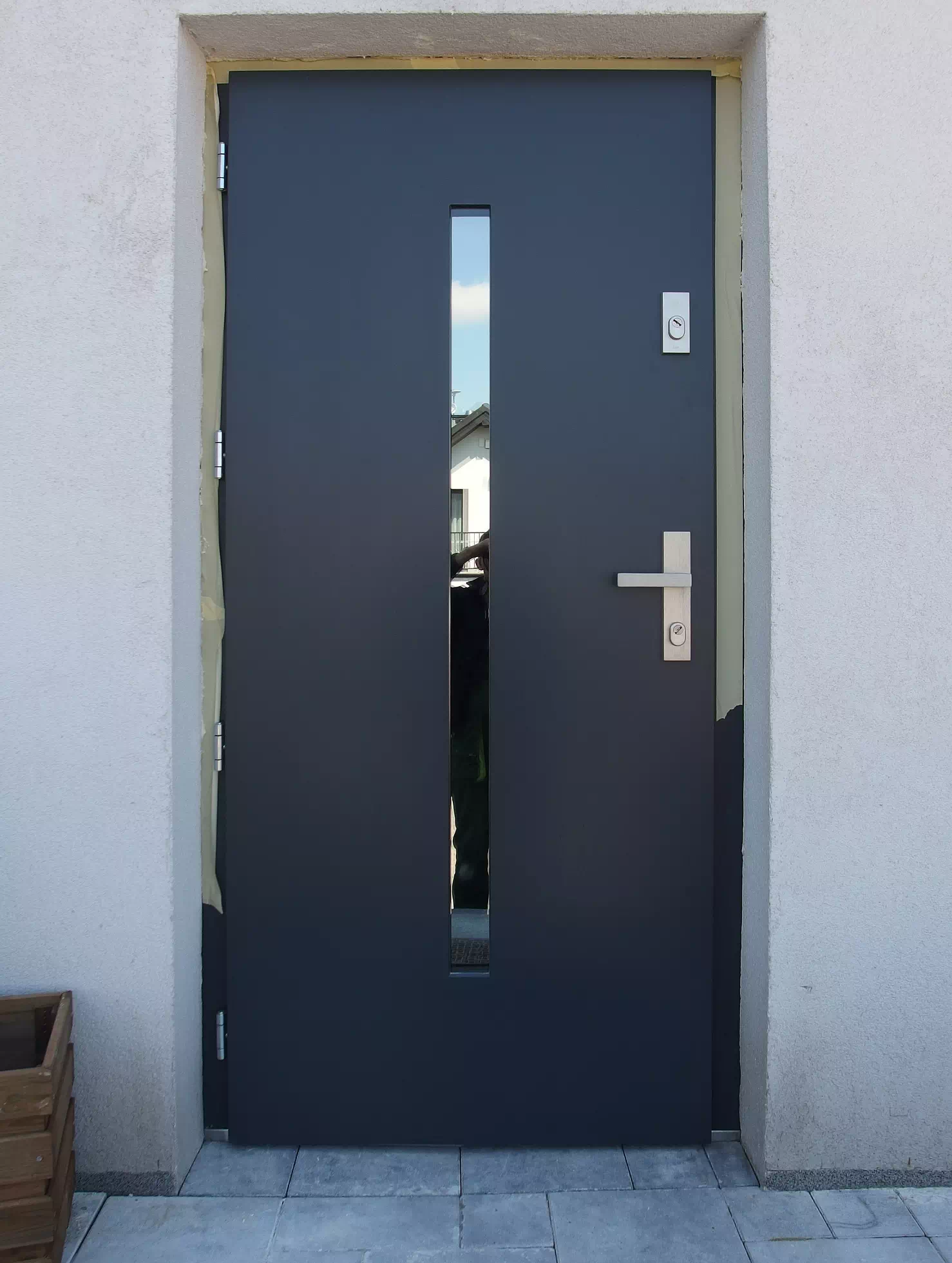 Przykład realizacji najprostszego modelu drzwi antywłamaniowych gładkich (bez przefrezowań ozdobnych) którego cechą wyróżniającą jest poziome usłojenie drewnianej okleiny skrzydła drzwiowego. Za ozdobę tego wzoru drzwi robi zwykle kompozycja skrzydła i ościeżnicy wymalowanych w różnych kolorach, a także pochwyt rurowy (antaba) i ewentualne odbojnik (kopacz) wykonany z drewna lub blachy inox.