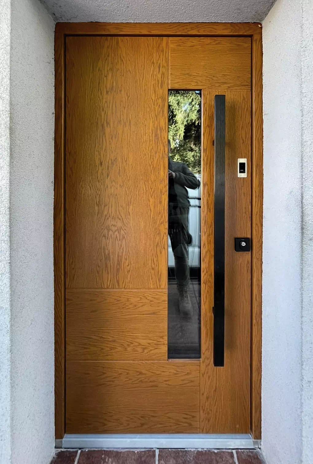 Przykład drzwi wejściowych z zamontowanym zamkiem elektrycznym z servonapędem i czytnikiem linii papilarnych służącym do ich otwierania. Drzwi ryglują się antywłamaniowo (pełne zamkniecie przez wysunięcie 7 rygli) po każdorazowym dosunięciu skrzydła do ścieżnicy.